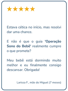 AVISO IMPORTANTE: As informações contidas no e-book "Operação Sono do Bebê" são baseadas em pesquisas e experiências de profissionais e mães, mas não substituem o aconselhamento individualizado de um pediatra ou especialista em sono infantil. Por isso, tenha em mente que os resultados podem variar de bebê para bebê, pois cada criança é única. Além disso, o sucesso dos métodos contidos nesse e-book, dependem exclusivamente da consistência na aplicação e da adaptação às necessidades individuais do seu bebê. Consulte sempre o pediatra do seu filho para quaisquer questões relacionadas à saúde e ao bem-estar dele.